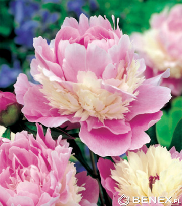Pfingstrose Sorbet Diese sehr beliebte Sorte zeichnet sich durch ihre charakteristischen, mehrschichtigen Blüten aus. Die Blüten haben rosafarbene äußere Blütenblätter und eine Schicht zarter weißer Blütenblätter in der Mitte, wodurch die Blüte an ein mehrfarbiges “süßes Sorbet” erinnert. Die Pflanze bildet einen kräftigen Strauch mit üppigem, grünem Laub und ist eine ausgezeichnete Wahl für Ziergärten und als Schnittblume.