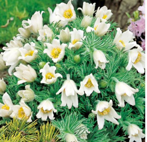 Pulsatilla Weiß, Die auch als Behaarte Pflanze oder Osterlilie bekannte Osterlilie ist eine frühblühende Staude mit zarten weißen Blüten. Die Blüten erscheinen im frühen Frühling und werden von charakteristischen, leicht behaarten Blättern begleitet, die der Pflanze ein besonderes, natürliches Aussehen verleihen.