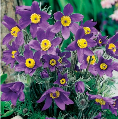 Pulsatilla Blau, Die Osterlilie, auch bekannt als Osterblume, ist eine frühblühende Staude mit dekorativen blauen bis blauvioletten Blüten. Die Blüten erscheinen im frühen Frühling und werden von charakteristischen, weich behaarten Blättern begleitet, die der Pflanze ein besonderes, natürliches Aussehen verleihen.