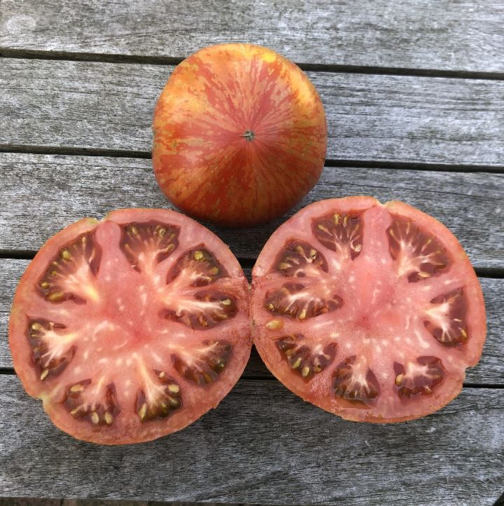 Tomatoes Solar Flare XL je osupljiva, velikoplodna sorta, znana po svoji izraziti barvi, izjemnem okusu in odlični rodnosti. Plodovi so veliki (200–350 g), rahlo sploščeni in imajo značilno rdečo osnovo z zlato rumenimi »sončnimi« progami, po katerih je sorta dobila ime. Meso je gosto, sočno, sladko in bogato aromatično, z zelo prijetnim ravnovesjem med sladkobo in nežno kislino – idealno za solate oz svežo porabo.